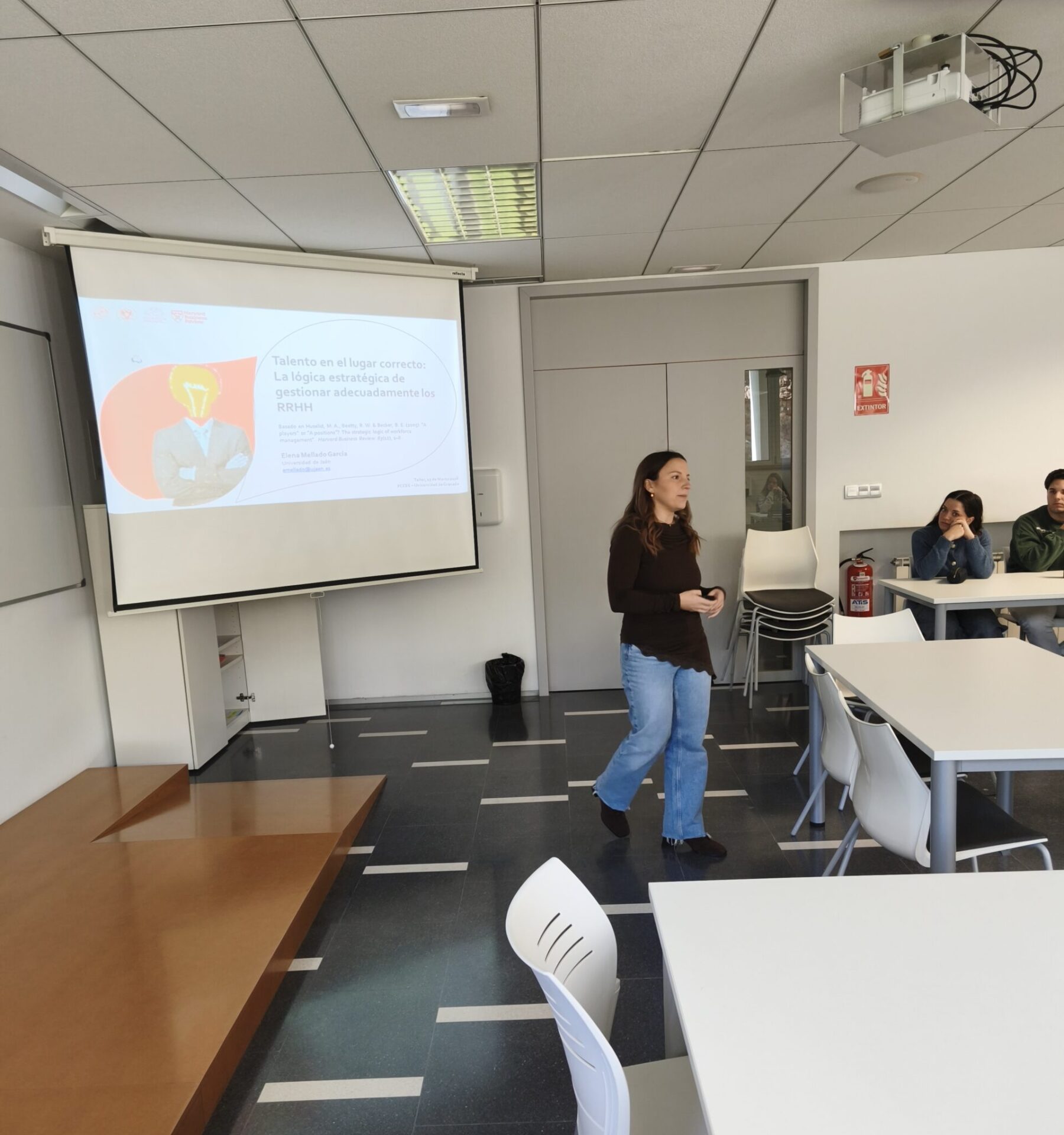 El pasado viernes, Elena Mellado visitó las aulas de la Universidad de Granada. La Facultad de Ciencias Económicas y Empresariales acogió una charla magistral organizada por el Departamento de Organización de Empresas II junto con la Incubadora de Talento, diseñada para mostrar el lado práctico, innovador y divertido de la gestión de personas en la asignatura de Dirección de Recursos Humanos de los grados en ADE-Derecho, ADE y Turismo.