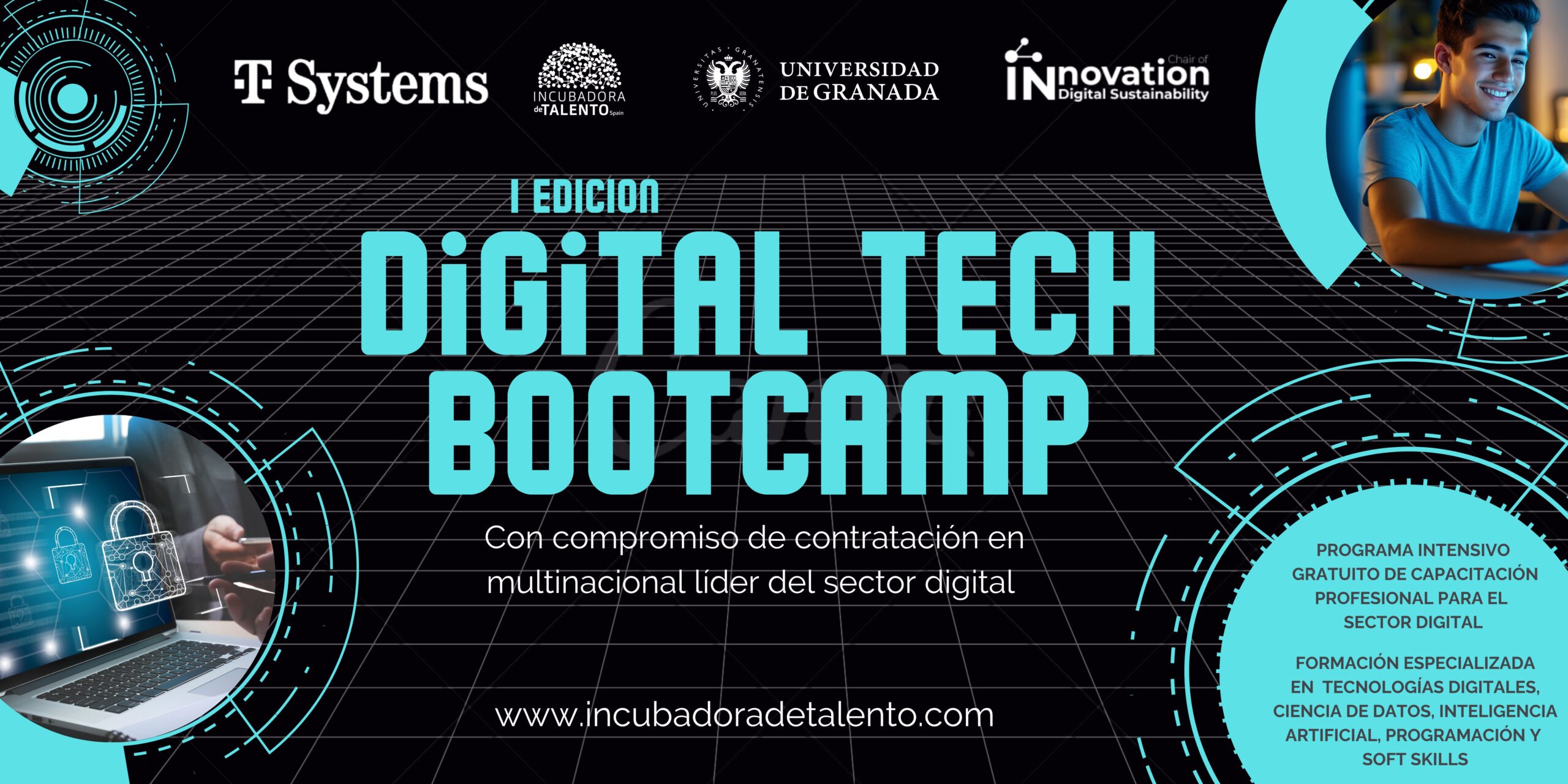 The Digital Tech Bootcamp is an intensive professional training program with an eminently practical nature, designed to develop young talent in the most in-demand cross-cutting technologies for business digitalization. It is developed by the Talent Incubator of the University of Granada in collaboration with T-Systems, a multinational company and leader in technology services, and strategic partner of the project through the T-Systems–UGR Chair of Sustainable Digitalization.